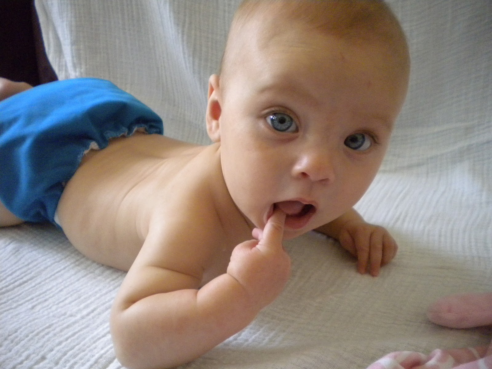 Nora didn't grow like a weed these past few months, but she is still doing just fine on her little growth curve. She is now almost 13 pounds and 24.5 inches. Her turning-4-months-old-week was a big week for her:
